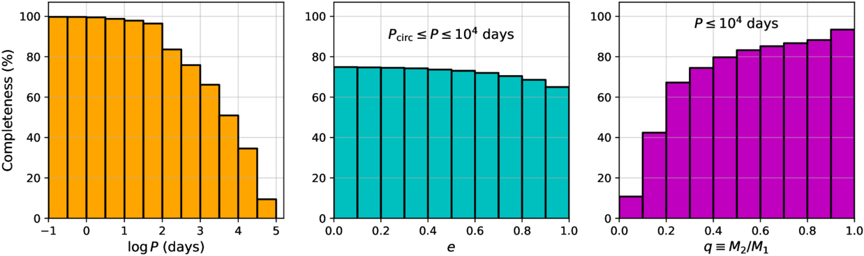 Results of our Monte Carlo simulations illustrating the sensitivity of our survey to spectroscopic binaries in the Hyades. The panels show our detection completeness as a function of orbital period, eccentricity (for Pcirc ≤ P ≤ 104 days), and mass ratio (P ≤ 104 days). Binaries with periods shorter than the circularization period Pcirc, taken here to be 5.9 days (see Section 11.2), are excluded from the calculation of our sensitivity as a function of eccentricity because their orbits have typically been made circular by tidal forces.