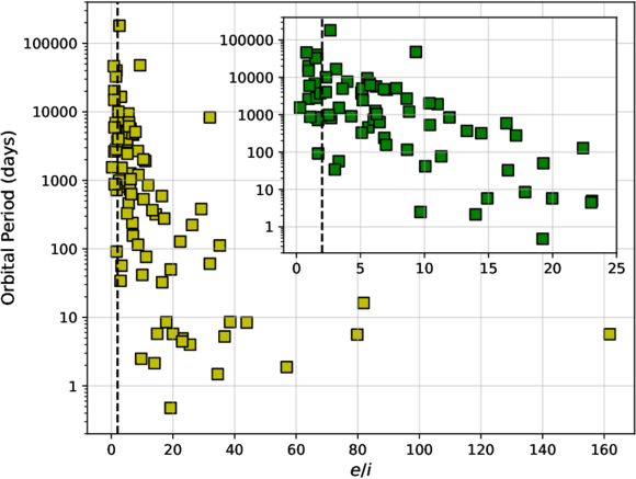 Orbital period as a function of the e/i statistic for members or possible members of the Hyades with known astrometric or spectroscopic orbits. The inset zooms in on the inner portion of the diagram (e/i < 25), and shows that most targets with e/i > 2 (marked with a dashed line) tend to have periods under 104 days, with very few exceptions. We may expect, then, that other objects with e/i > 2, which we consider to be binaries even though the orbits are unknown, will also typically have periods under 104 days, and we include them in the calculation of the multiplicity fraction.