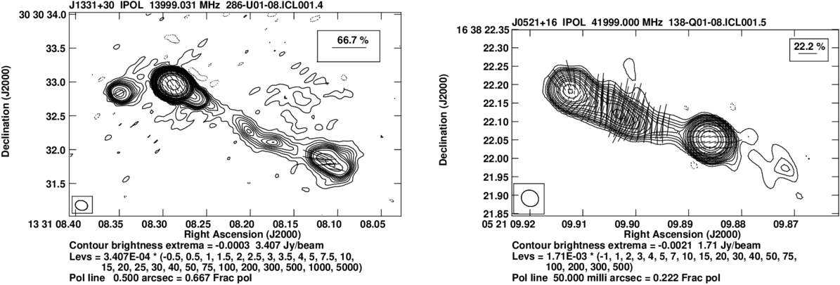 Maps of the polarized calibrators 3C286 (left panel) at 14 GHz with 150 mas resolution, and 3C138 (right panel) at 42 GHz with 45 mas resolution. For 3C286, both the Stokes I and polarized flux density are dominated by the nuclear emission; the Stokes I extended emission accounts for only 166 mJy compared to 3.58 Jy for the nuclear core. For 3C138, the situation is quite different—the Stokes I extended emission is much stronger, accounting for 571 mJy compared to 1.710 Jy for the nucleus, while the polarized emission at this band is about equal between the jet and the nucleus.