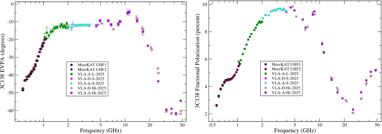 Showing the intrinsic EVPA (left panel) and polarization fraction (right panel) for 3C138 from VLA and MeerKAT data. These data have been corrected with ALBUS G01 IFRM estimates. The oscillatory behavior seen above 4 GHz is due to a beating between the nuclear polarized emission and that from the subarcsecond jet.