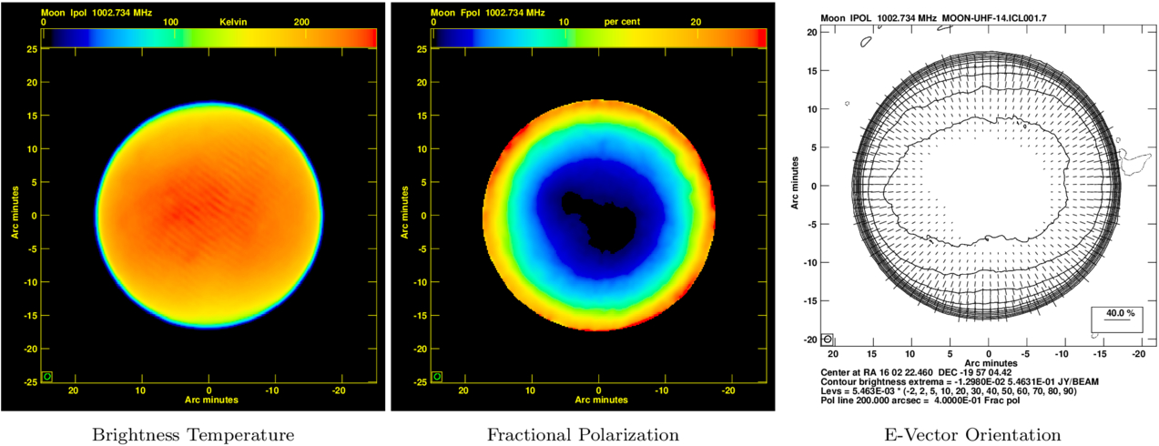 Color-coded MeerKAT images of the Moon at 1002 MHz. The Stokes I brightness (left panel) is nearly featureless while the fractional polarized brightness (center panel) is strongly peaked toward the limb, with fractional polarization reaching 30% near the lunar limb. The EVPA vectors (right panel) are nearly radial. The slight ripple seen in the Stokes I image is from a deconvolution instability.