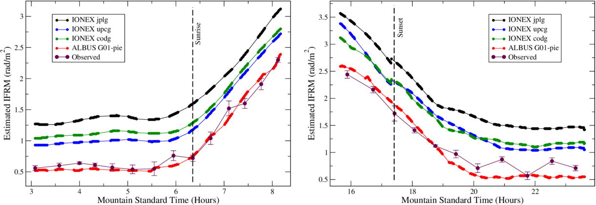 The lunar IFRM estimates from three global and two local models, for the “D2” observation (left panel) and the “DC” observation (right panel). The three displayed global estimates are representative of all seven global maps we have investigated. The vertical dashed line marks sunrise or sunset. The plotted data points (in maroon, with error bars) are the actual IFRM values determined from the lunar observations.