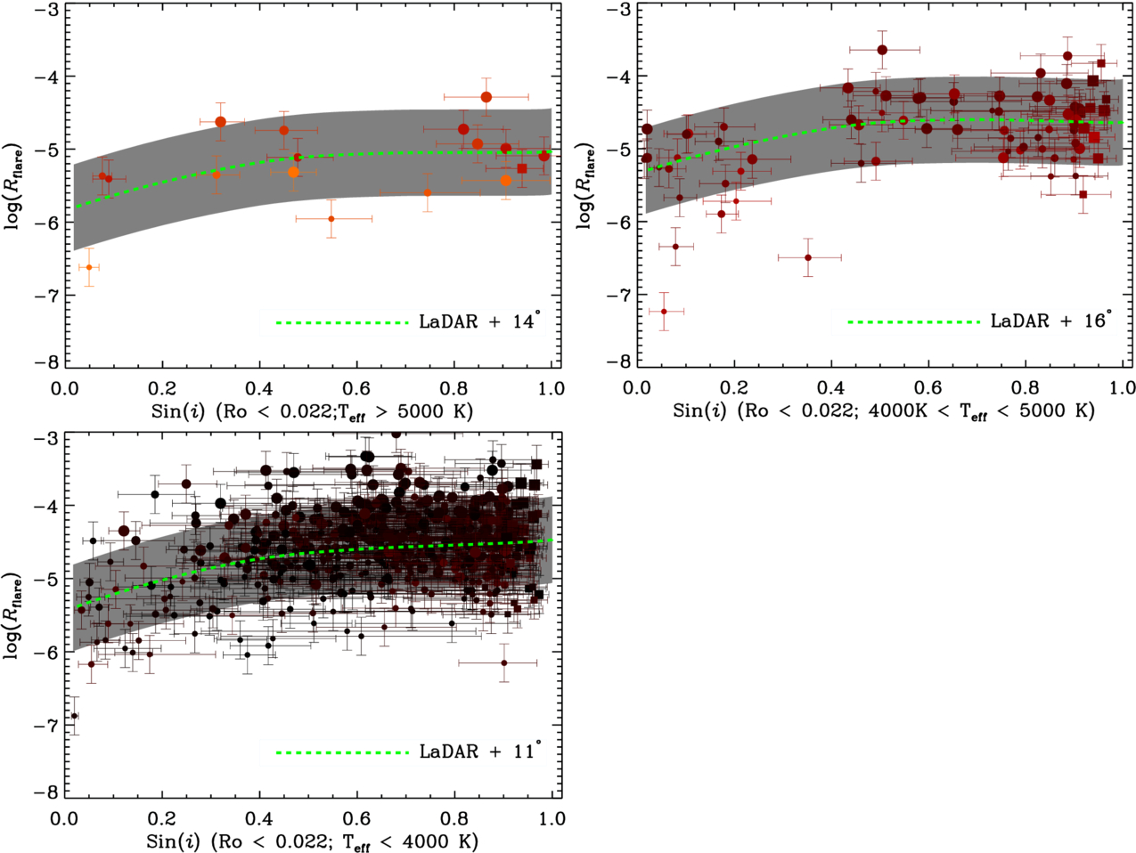 Same as Figure 3, but for three temperature bins of fast rotators. The sample includes polar spot stars whose inclinations are from K. G. Strassmeier (2009; Figure 5).