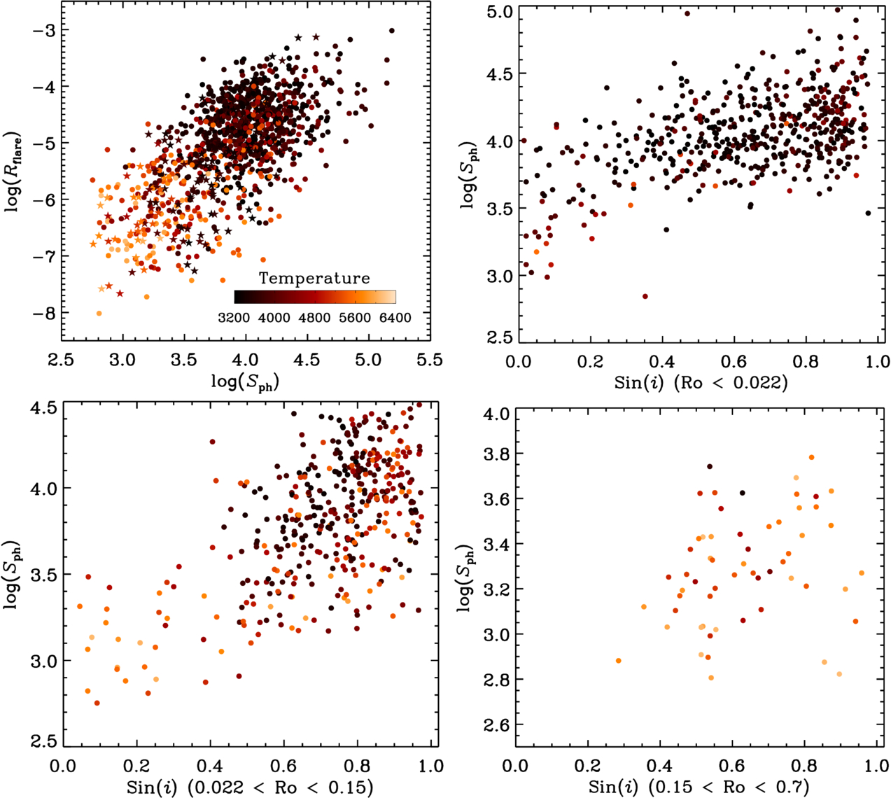 Relations on the proxy of light-curve modulation Sph. The top left panel shows its relation to the flaring activity. The other panels show its relations to the inclination in the C, g, and I phases, respectively.