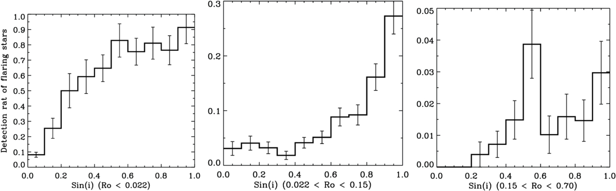 The detection rates of flaring stars along with inclination in the C, g, and I phases. The detection rate is the ratio between the number of flaring stars and the number of rotating stars in a sini bin. Error bars of each sini bin were estimated using the square root of the number of flaring stars in each bin.