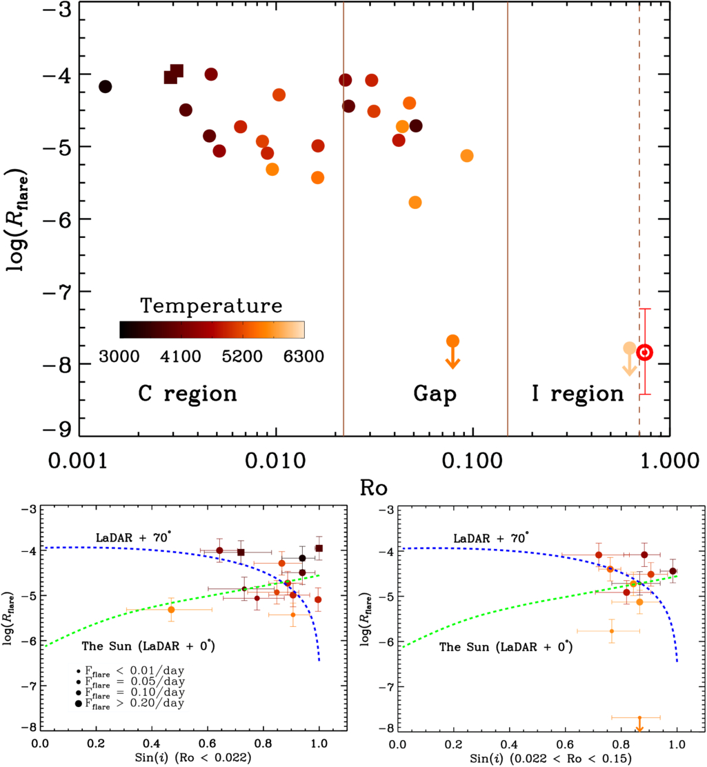 Top panel: the rotation–flaring activity relationship of 26 stars that have the TESS observations and ZDI measurements. The filled circles represent stars that are found to be high latitude by ZDI. The filled squares represent stars that are found to be without high-latitude spots by ZDI. Stars without detectable flares are plotted with downward arrows. Bottom panel: same as Figure 4, but for stars in the top panel. The green and blue dashed lines denote the solar-like and polar latitudinal distribution, respectively.