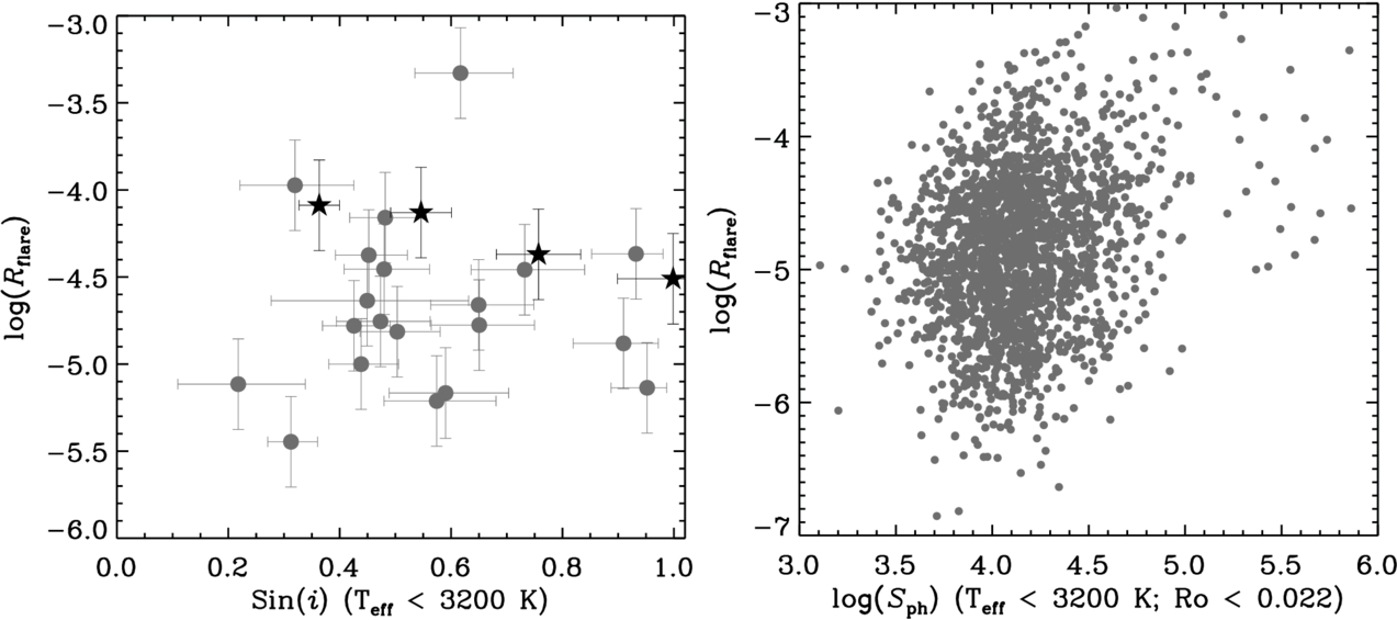 Left panel: the sini–flaring activity relationship for FC stars (Teff < 3200 K). The filled circles denote flaring stars in our sample, and the filled stars denote the four stars in E. Ilin et al. (2021), where high-latitude flares have been identified. All stars are fast rotators and in the C region. Right panel: the Sph–flaring activity relationship for FC stars in the C region. The Pearson correlation coefficient is r ≈ 0.23.