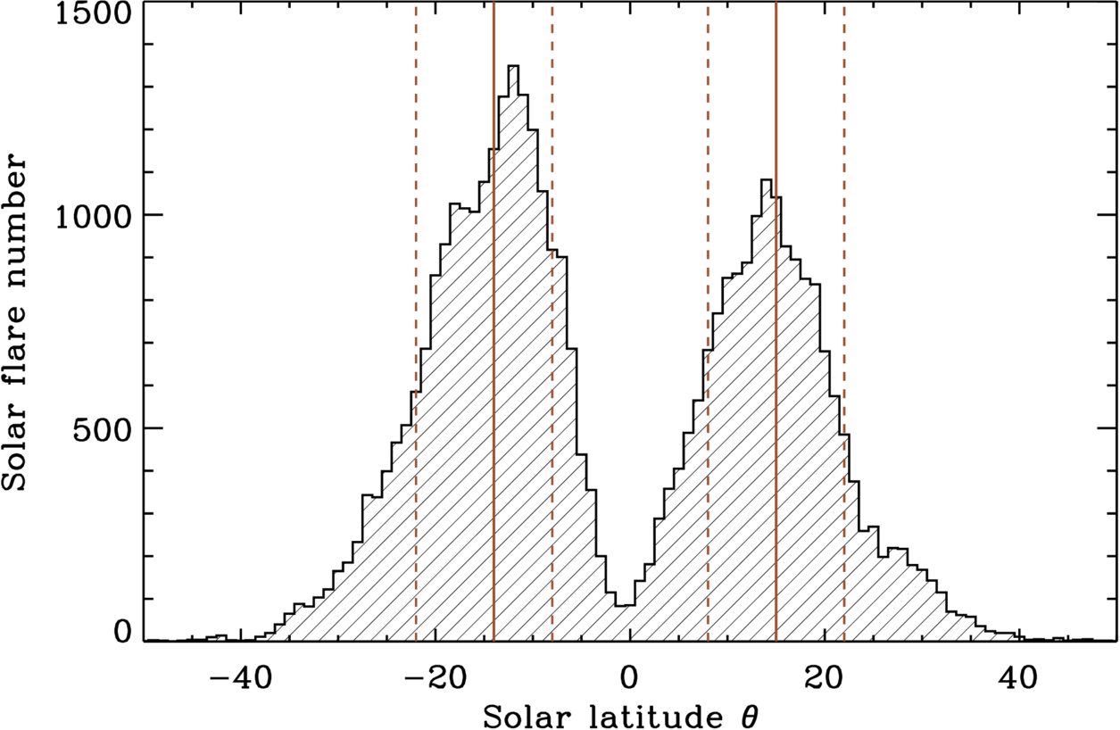 The latitudinal distribution of solar flares from 1975 to 2017. In each hemisphere, the 50th percentile (the vertical solid lines) is taken as the mean latitude of solar flares, and the 16th and 84th percentiles (the vertical dashed lines) are taken as the uncertainties. Their values are ﹩\theta ={(-1{4}_{-8}^{+6})}^{\circ }﹩ and ﹩{(1{5}_{-7}^{+7})}^{\circ }﹩, respectively.