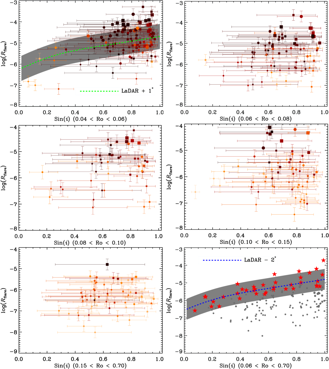 Same as Figure 3, but for several larger Ro bins. The bottom right panel shows the relation in the range of 0.06 < Ro < 0.7. We take stars larger than the 84th percentile (or at least three stars) in each sini bin as the upper envelope of the relation. Stars observed in the upper envelope are denoted by the red filled stars.