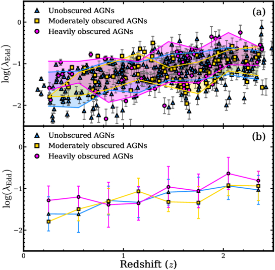 ﹩\mathrm{log}\left({\lambda }_{{\rm{Edd}}}\right)﹩ values vs. redshifts. Filled blue triangles, yellow squares, and magenta circles correspond to unobscured (E(B − V) ≤ 0.1), moderately obscured (0.1 < E(B − V) ≤ 0.2), and heavily obscured (E(B − V) > 0.2) AGNs, respectively. (a) Colored polygons indicate the median ﹩\mathrm{log}\left({\lambda }_{{\rm{Edd}}}\right)﹩ and 1σ dispersions in eight redshift bins. (b) Median ﹩\mathrm{log}\left({\lambda }_{{\rm{Edd}}}\right)﹩ values in the same eight redshift bins are shown with 1σ dispersions.