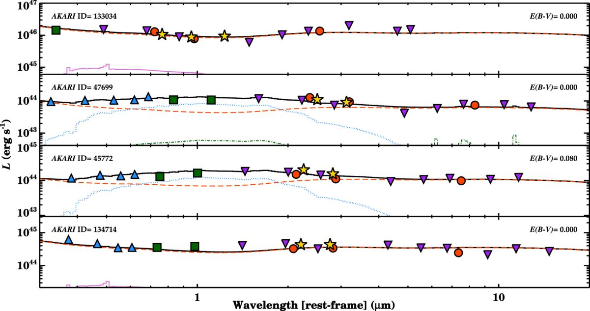 Best-fit SED results and corresponding photometric data for four randomly selected type 1 AGNs. Blue triangles, green squares, purple triangles, red circles, and yellow stars represent the photometric data from Subaru HSC (N. Oi et al. 2021), FLAMINGOS KPNO (Y. Jeon et al. 2014), AKARI IRC (S. J. Kim et al. 2012), WISE (T. H. Jarrett et al. 2011), and Spitzer IRAC (H. Nayyeri et al. 2018), respectively. The solid black line shows the best-fit SED model, while the dashed red, dotted blue, dotted–dashed green, and dot-dotted–dashed purple lines represent the reddened spectra of AGN, elliptical, spiral, and irregular galaxies, respectively.