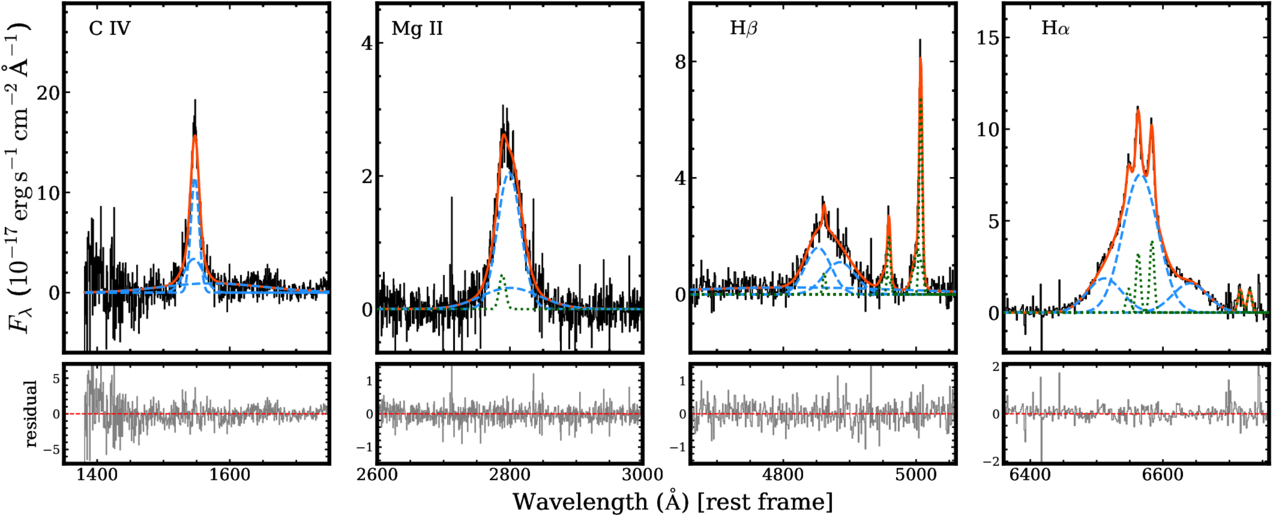 Examples of spectral fitting results for the C IV, Mg II, Hβ, and Hα line complexes. In the upper panels, the black lines show the rest-frame continuum-subtracted spectra. The dashed blue and dotted green lines represent the broad and narrow emission-line models, respectively, and the solid red lines indicate the combined best-fit model of the broad and narrow lines. The lower panels show the fitting residuals.