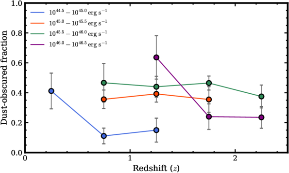 Dust-obscured AGN fraction as a function of redshift in four bolometric luminosity subsamples. The filled blue, red, green, and purple circles and lines denote the fractions for Lbol ranges of 1044.5–1045.0, 1045.0–1045.5, 1045.5–1046.0, and 1045.5–1046.0, respectively. Only cases where the number of AGNs is at least ten are shown to avoid the effects of small number statistics.
