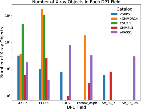Number of X-ray sources by X-ray catalog in each DP1 field. The majority of X-ray sources are found in the Extended Chandra Deep Field—South (E-CDF-S), which is well observed by X-ray telescopes.