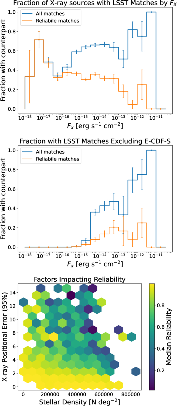 Top: The fraction of sources in each X-ray Flux bin with a match and with a reliable match in the DP1 Object catalog. The error bars show the standard error. The fainter X-ray sources are dominated by sources from the CSC2.1, which are generally well localized, leading to an increase in the fraction of sources with reliable matches. Middle: Excluding the E-CDF-S field, which is both the best observed by X-ray observatories and by DP1, we see that the fraction falls off strongly with absorbed X-ray flux. This is more indicative of what we expect a crossmatch to early Rubin (e.g., DR1) data may look like. Bottom: the main factors impacting our reliability score are the X-ray positional error and the density of Objects around the X-ray source.