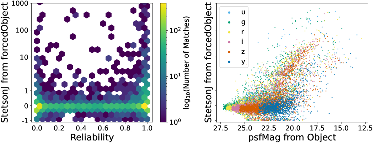 There may be a slight association between the reliability of a crossmatch and the Stetson J index of the object, as seen in the histogram on the left. The Stetson J appears to increase with a subset of brighter Objects, shown by the spur in the right plot. A possible explanation for the spur is a systematic underestimate of the photometric error. We use a symmetric logarithmic (symlog) scale for the y-axis.