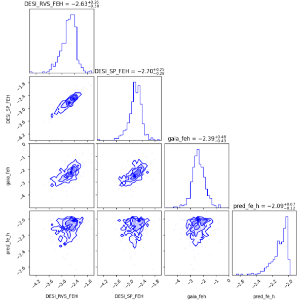 Corner plot of metallicity estimates for the crossmatched VMP subsample (∼500 stars). Diagonal panels show the one-dimensional distributions of [Fe/H]RVS and [Fe/H]SP from the DESI RVS and SP pipelines, the metallicity [Fe/H]GaiaXP derived by L. Yang et al. (2025) from Gaia XP spectra, and the model-predicted [Fe/H]model, with the median and 16th/84th percentiles indicated in the panel titles. Off-diagonal panels display the corresponding two-dimensional distributions for each pair of metallicity estimates.