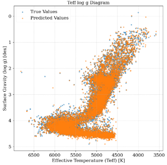 Predicted (orange) and reference (blue) distributions in the Teff–﹩\mathrm{log}g﹩ plane. Note that the Teff axis is inverted.