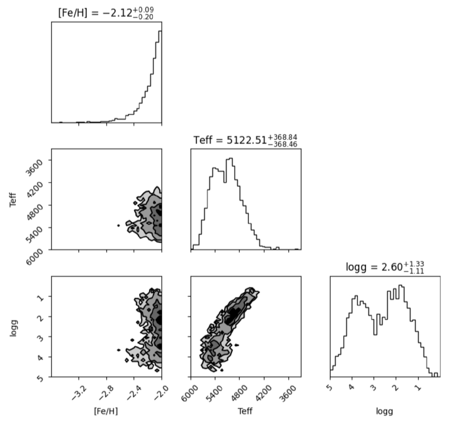 Corner plot of the atmospheric parameters predicted by the dual model for the final sample of 2569 VMP candidates. Diagonal panels show the one-dimensional distributions of [Fe/H], Teff, and ﹩\mathrm{log}g﹩ (with the median and 16th/84th percentiles indicated on top), while off-diagonal panels show the corresponding two-dimensional density distributions.