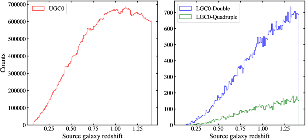 Left panel: the redshift distribution of galaxies in the unlensed catalog, UGC0 (red), which contains approximately 64 million galaxies. Right panel: the redshift distributions of galaxies in the lensed catalog, LGC0. The number of quadruple-image systems (green) is smaller than that of double-image systems (blue) because the lensing cross section for quadruple-image formation is much smaller than that for double-image formation.