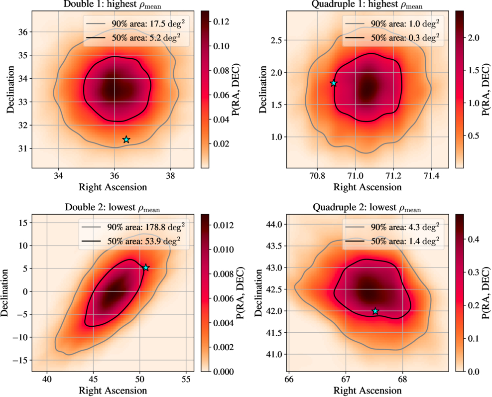 Sky-localization maps for selected double- and quadruple-image systems. The left (right) panels show double (quadruple) image systems. The top row corresponds to systems with the highest ρmean, which exhibit the most tightly constrained sky localizations, while the bottom row shows systems with the lowest ρmean, showing the broader posterior regions. The black and gray solid contours represent the 50% and 90% credible regions, respectively. The star symbols mark the true sky positions of the corresponding GW lensing systems.
