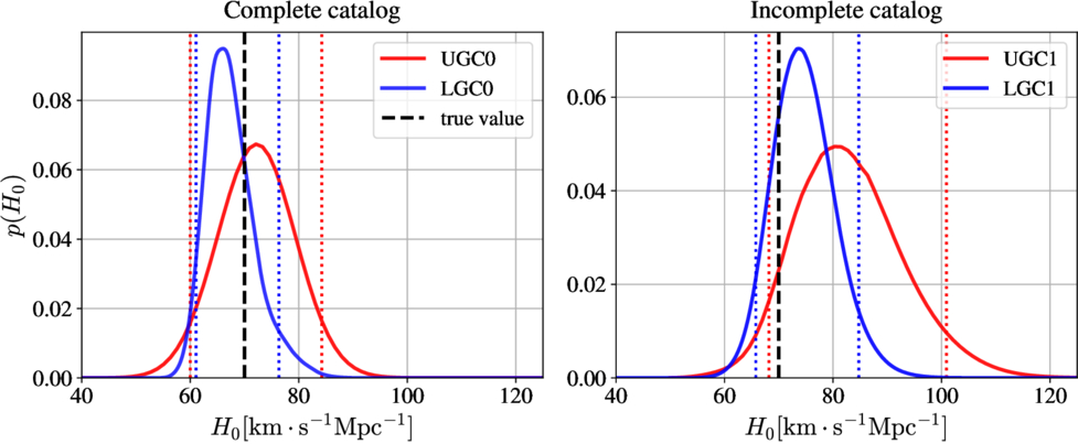 Posteriors of H0 for the four analysis scenarios. The left panels use complete galaxy catalogs (UGC0 and LGC0), while the right panels incorporate catalog incompleteness (UGC1 and LGC1). Unlensed and lensed cases are shown by solid red and solid blue lines, respectively. The dashed black lines indicate the true value of H0. In all cases, spectroscopic redshift measurements are employed. Although the lensed cases comprise only eight events compared with 250 unlensed signals, they still produce tighter posteriors. Incomplete catalogs broaden the posteriors due to increased uncertainty in host-galaxy identification, while less precise delensing in the lensed cases increases the luminosity-distance uncertainty, further widening the H0 posterior.