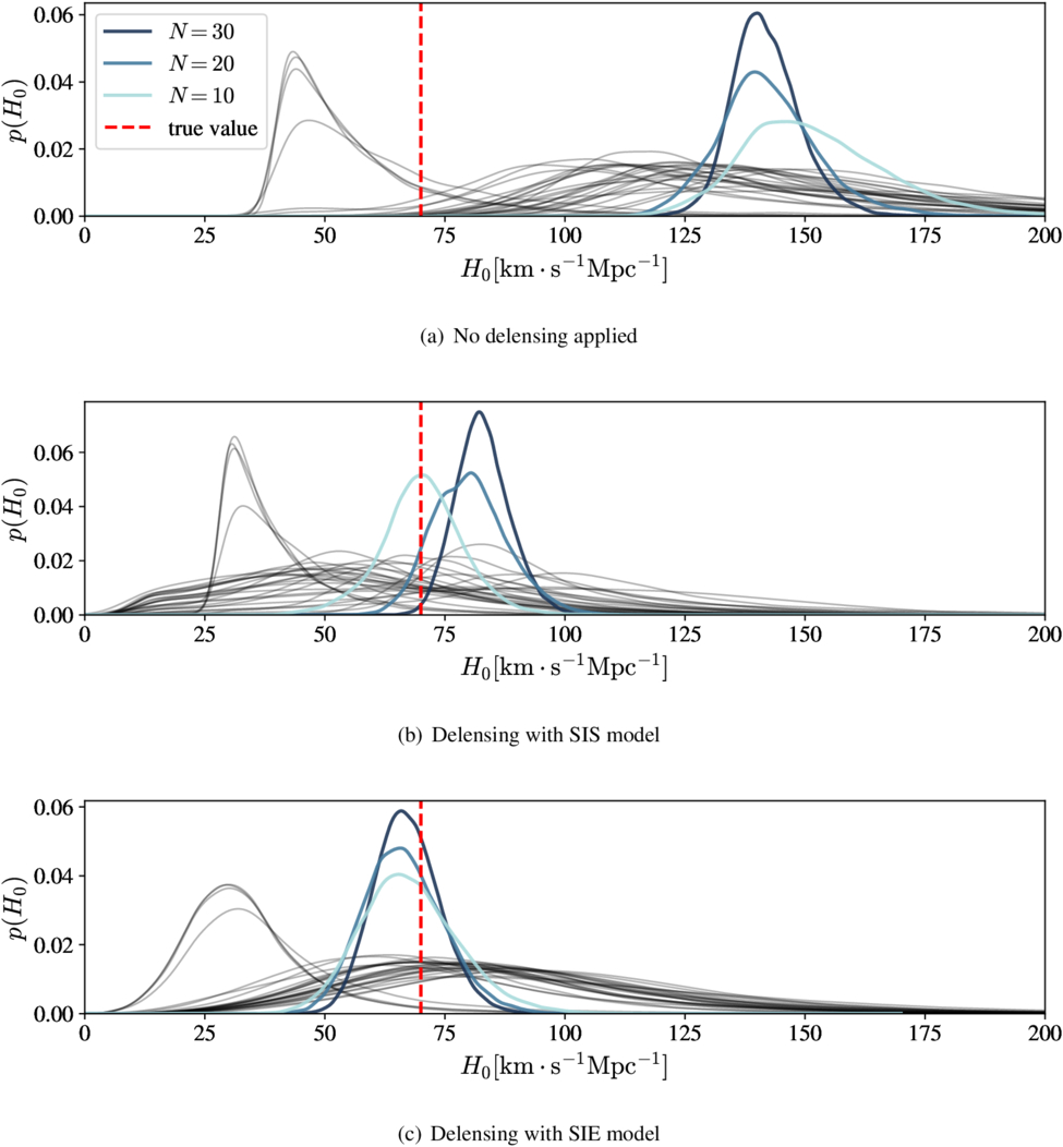 H0 posteriors obtained from multiple realizations of a double-image BBH lensing system with a true SIE mass profile. Gray curves show the posterior from each individual realization, while the sky-blue (N = 10), blue (N = 20), and navy (N = 30) curves represent the progressively combined posteriors. The dashed red lines indicate the true value of H0. The top, middle, and bottom panels correspond to the cases of no delensing, SIS delensing, and delensing with the correct SIE model, respectively. In the absence of delensing, the inferred H0 is strongly biased for all realization numbers. When delensing is performed with an incorrect SIS model, the bias is less apparent for a small number of realizations but becomes increasingly significant as realizations accumulate, even though the credible intervals shrink. In contrast, delensing with the correct SIE model recovers an unbiased estimate of H0.