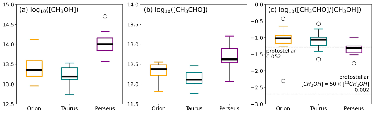 The boxplots of the CH3OH column densities (a), CH3CHO column densities (b), and the ratio between them (c) in starless cores from different clouds. The statistics were achieved in logarithmic space. The data of Taurus and Perseus clouds were adopted from S. Scibelli & Y. Shirley (2020) and S. Scibelli et al. (2024), respectively. In panel (c), the protostellar core values are adopted from S.-Y. Hsu et al. (2022).