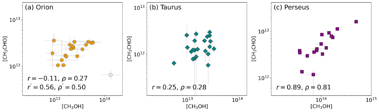 The scatter plots of the CH3OH and CH3CHO column densities in starless cores from different clouds. The data of Taurus and Perseus clouds were adopted from S. Scibelli & Y. Shirley (2020) and S. Scibelli et al. (2024), respectively. The r and ρ represent the Pearson and Spearman correlation coefficients, respectively. In panel (a), the ﹩{r}^{{\prime} }﹩ and ﹩{\rho }^{{\prime} }﹩ are the coefficients excluding the outlier illustrated by the white color.