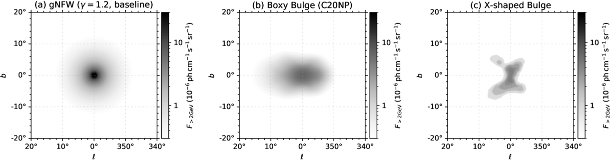 Several spatial models for the GC excess: (a) the J-factor map given the gNFW profile with an inner slope of γ = 1.2, (b) a nonparametric bulge model (B. Coleman et al. 2020), and (c) an X-shaped bulge map (O. Macias et al. 2018; S. D. McDermott et al. 2023). The intensity of the each component is based on the best-fit model given the GC excess template. We do not convolve the maps with the PSF.