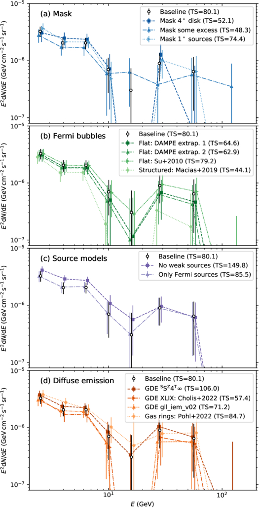 The systematic uncertainty of the GC excess caused by the analysis procedures and the background models, including (a) the mask, (b) the Fermi bubbles template, (c) the point and extended sources, and (d) the GDE models. The points show the SEDs and the statistical uncertainties measured at 5∘ from the GC. The TS values in the labels are for the 2−200 GeV data. The central energies are slightly offset to avoid overlapping.