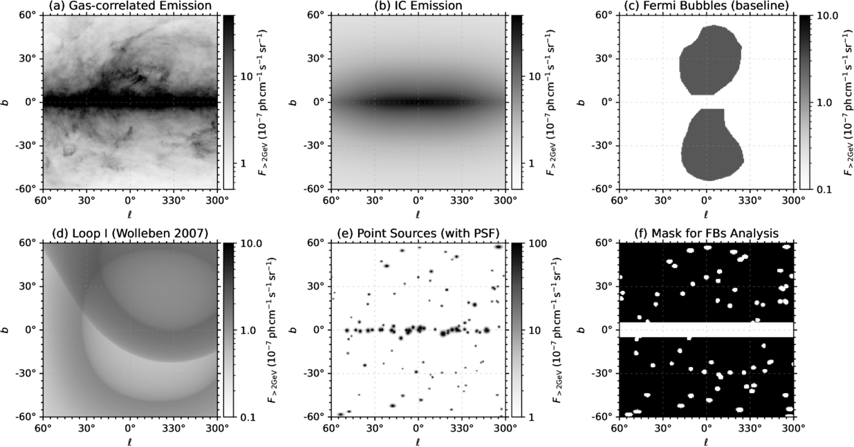 (a)–(e) Maps of the components and (f) mask in the analyses of the Fermi bubbles. The maps include (a) hadronic and bremsstrahlung emission associated with the gas, (b) IC emission, (c) flat template of Fermi bubbles, (d) geometric template of Loop I, and (e) bright point sources. We do not convolve the first four maps with the PSF. The white regions in the mask are excluded from the data analysis. Both the maps and mask are converted from the HEALPix projection.