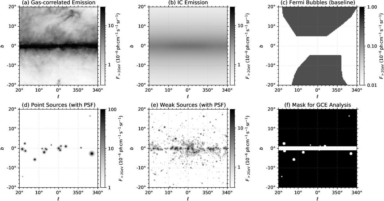 (a)–(e) Maps of the components and (f) mask in the analyses of the GC excess. The first four components are the same as those in the analyses of the bubbles. The color bars are adjusted for better visualization. The fifth map is for the weak sources detected by Fermi but not by DAMPE.