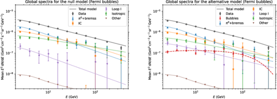 The mean fluxes of the components within the ROI for the best-fit global null (left) and alternative (right) models of the Fermi bubbles analysis. The data points show the best-fit SEDs from the bin-by-bin analysis.