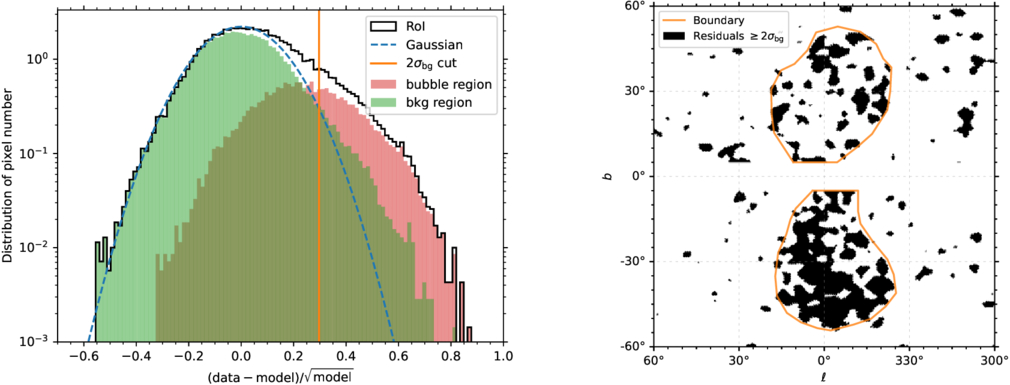 Left panel: distribution of the values in the significance map. The map, in HEALPix projection, is smoothed with a 1∘ Gaussian kernel. The black histogram shows the distribution of pixel numbers within the ROI, whereas the red and green ones show those within and outside the bubbles, respectively. The blue dashed line is a Gaussian profile with a mean value of zero fitted to the background histogram. The orange solid line represents the 2σbg cut adopted to define the bubbles’ boundary. Right panel: map with significance larger than the 2σbg cut. The bubble template in this work consists of two polygons whose boundaries are illustrated with the solid orange lines.