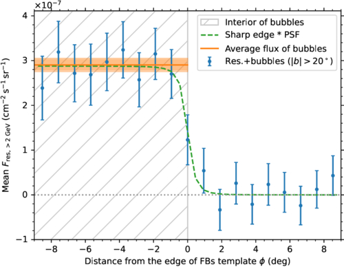 The average residual flux as a function of angular distance to the edge in the high-latitude region with ∣b∣ > 20∘ (blue points). The residuals are obtained by extracting the best-fit model except for the bubbles from the data. The negative (positive) x-axis values represent the region inside (outside) the bubbles. The green dashed line is the sharp edge convolved with the PSF. The orange band is the average flux of the bubble template as a whole.