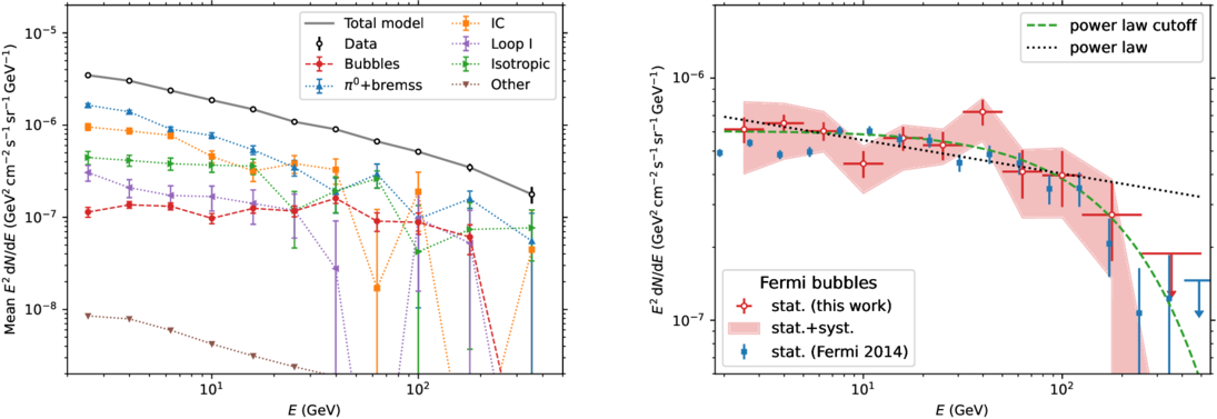 Left panel: the average fluxes of the observed data (black hollow points) and various fitted components in the baseline model (solid points connected with lines) within the ROI. The red points show the flux of the bubbles. The masked Galactic plane and point sources are excluded from the calculation. Right panel: the SED of the Fermi bubbles. The red points show the best-fit SED from DAMPE given the baseline model, whereas the blue points show those from Fermi-LAT (M. Ackermann et al. 2014). A 95% upper limit is given when the TS value is below nine. The red band exhibits the total errors from the statistical and systematic uncertainties. The optimal single PL model and PL cutoff model are also presented with black dotted and green dashed lines, respectively.