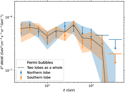 The SEDs of the northern (blue) and southern (orange) lobes. The points show the baseline spectrum and the statistical uncertainties, whereas the bands give the total errors. The black dashed line is the best-fit SED of the whole bubbles.