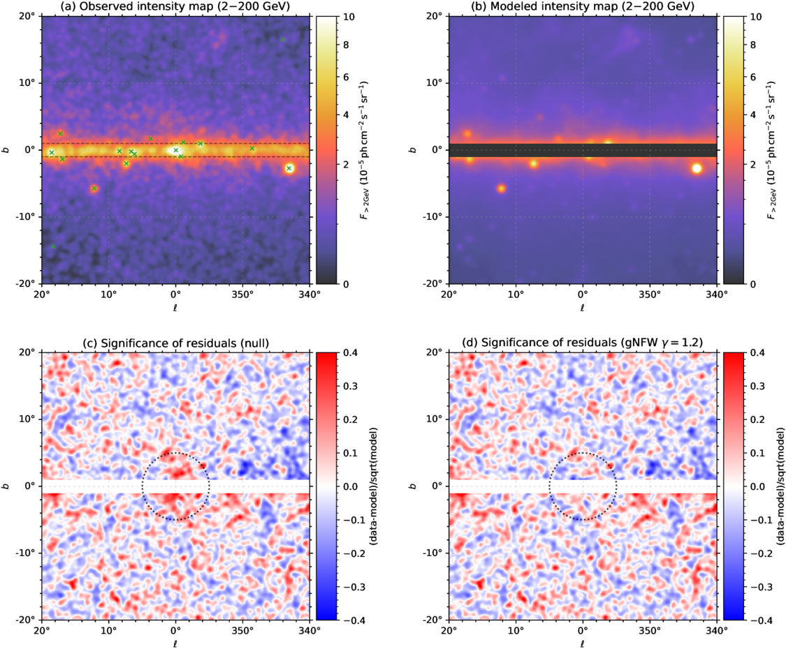 Upper panels: integrated intensity map of the ROI from (a) the observations and (b) the best-fit null model. The green crosses represent the point sources in the DAMPE catalog. The black dashed line encloses the Galactic plane region (∣b∣ < 1∘) that is masked in the likelihood analysis. Lower panels: the significance of the residual maps for the model (c) without and (d) with the GC excess model. The black dotted line shows a 5∘ circle centered at the GC. All the maps are smoothed with a ﹩\sigma =0\mathop{.}\limits^{^\circ }3﹩ Gaussian kernel.