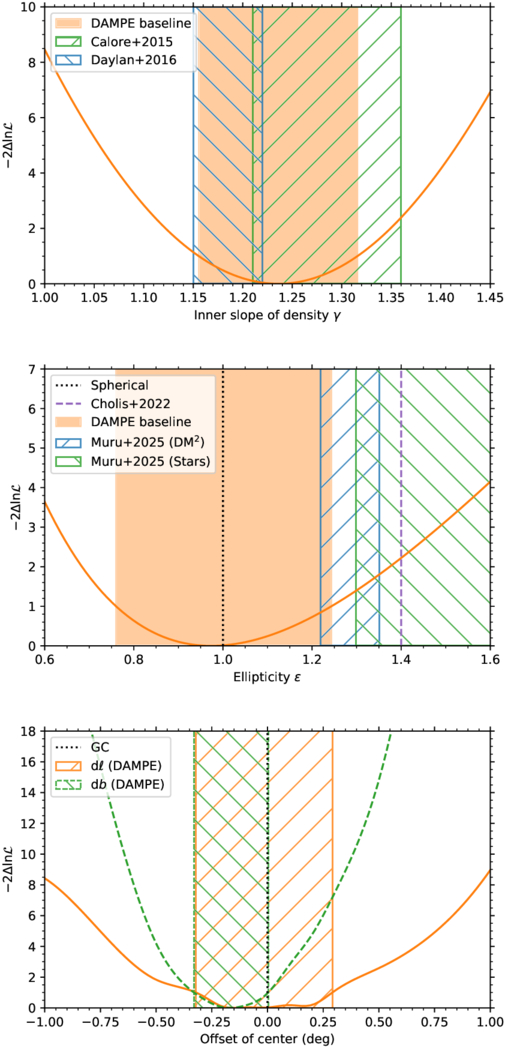 The change of log-likelihood value as a function of the steepness (upper), the ellipticity (middle), and the center position (lower) of the DM density profile derived with the 2−20 GeV data assuming the baseline background model. In the lower panel, the orange solid and green dashed lines show the likelihood variation vs. Galactic longitude and latitude, respectively.