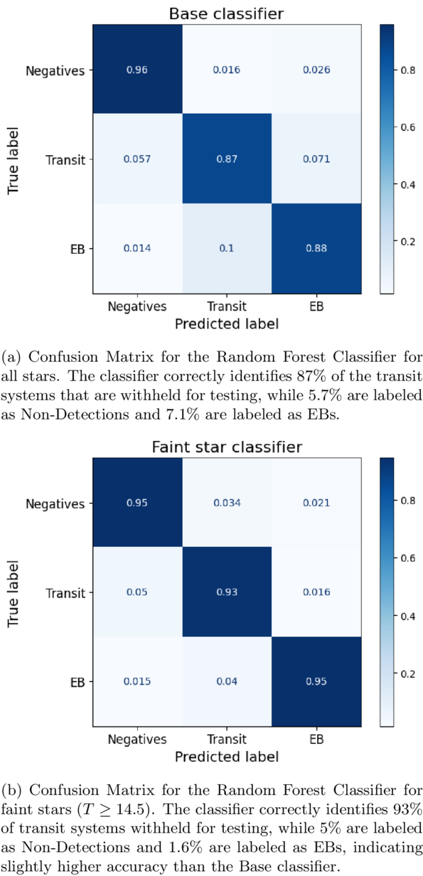 Confusion matrices for the base classifier (all stars; top) and the faint star classifier (T ≥ 14.5; bottom). Both classifiers are highly effective at identifying transit-like signals from noise, but there are erroneous classifications, many of which are addressed in the subsequent vetting procedure.