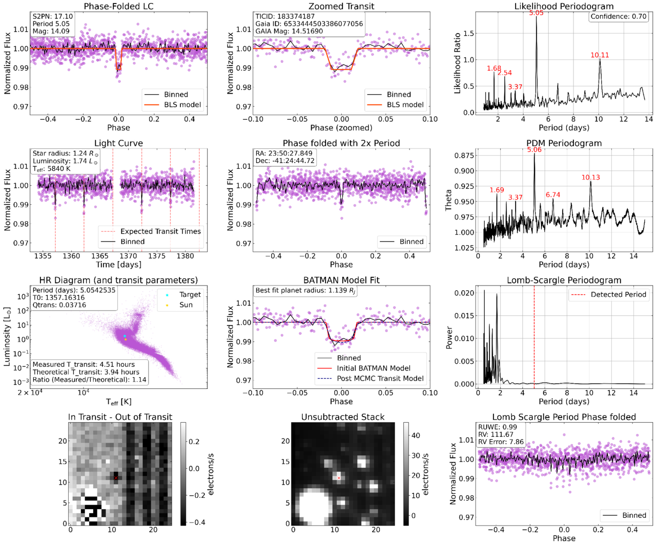 Example vetting “summary” plot for the now confirmed exoplanet TIC 183374187. A detailed description of each panel is provided in the main text. The complete figure set contains one image for each of the 11,143 objects in Table 1 and the 411 single-transit candidates, and it is accessible via the Harvard Dataverse at doi:10.7910/DVN/CWEUGW.