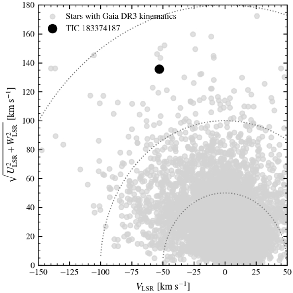 Toomre diagram showing the Galactic space velocities of TIC 183374187 relative to the local standard of rest (LSR). The star’s velocity components (ULSR,VLSR, andWLSR) were computed using Gaia DR3 astrometry and radial velocity. The dashed curves indicate loci of constant total space velocity. Gray points indicate kinematics of the other targets in my sample with a Gaia DR3 radial velocity measurements. The position of TIC 183374187 indicates kinematics consistent with membership in the Galactic thick disk. This interpretation is supported further by spectral chemical abundance measurements.