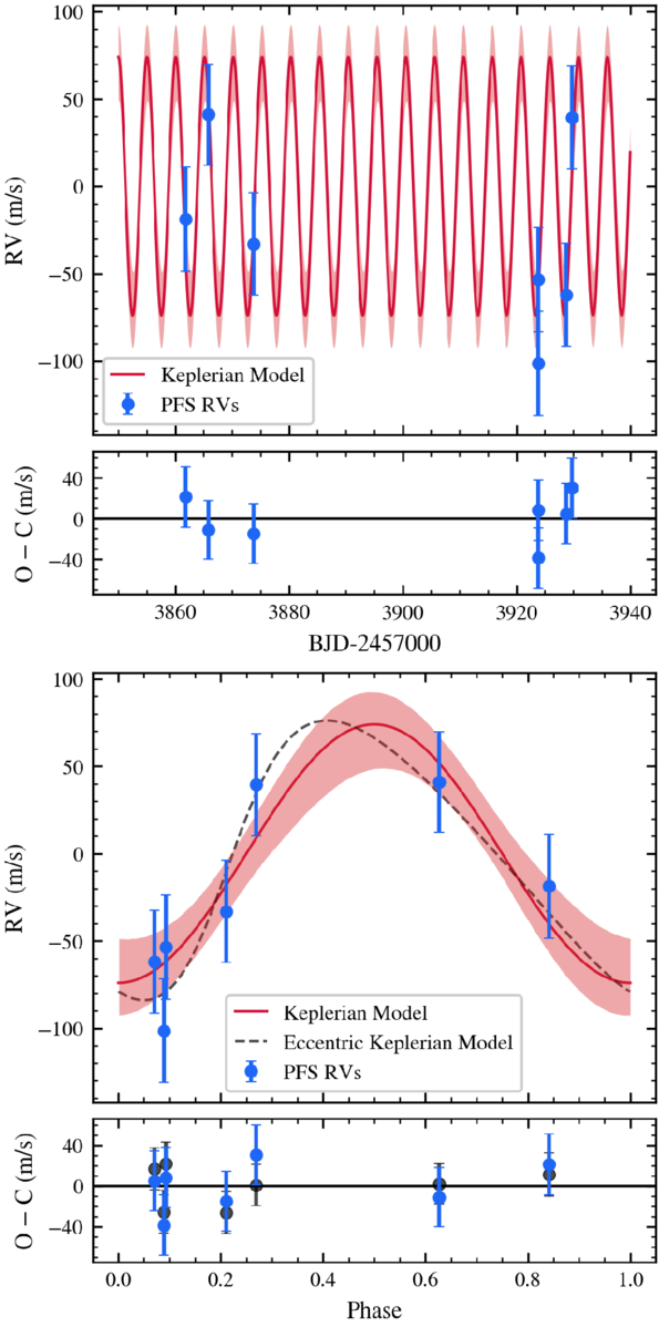 The top panel shows the seven radial velocity data points along with the best-fit Keplerian model and the corresponding 1σ uncertainty region in red. Plotted directly below are the residuals. Similarly, the bottom panel shows the phase-folded equivalent, also with corresponding residuals. The best-fit eccentric Keplerian model is shown as a dashed line, and its residuals are plotted as black data points.