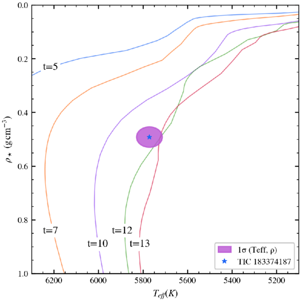 Position of TIC 183374187 on the stellar density versus effective temperature plot, along with our 1σ uncertainty in violet. Plotted in various colors are stellar isochrones for the inferred metallicity of TIC 183374187, which were obtained via MIST. The ages are in Gyr. It is apparent that TIC 183374187 is near the turnoff of the 12 and 13 Gyr isochrones, hinting at an old, slightly evolved host star.