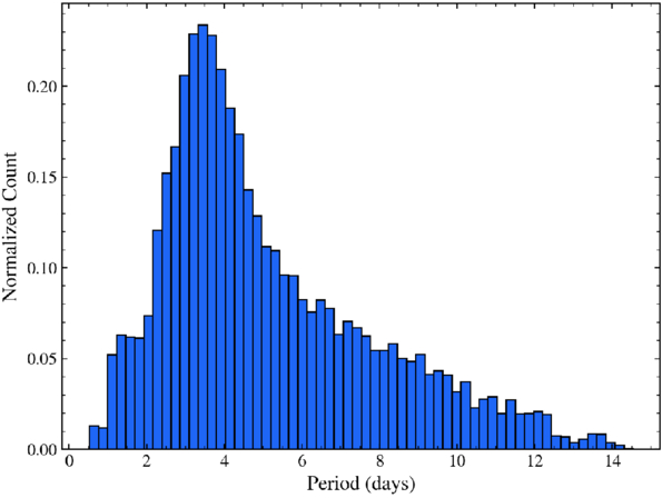 Period distribution of our candidates. The prominent peak around 3.5 days is expected from hot Jupiter surveys, since hot Jupiters constitute a majority of our candidates, while the falloff toward longer periods is due to the decreasing transit probability and lower S/N of longer-period candidates.