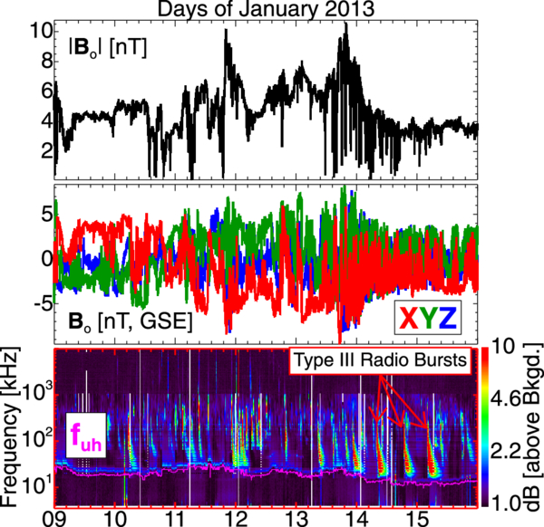 Example showing our ability to automatically find fuh during 2013 January. The plot shows, from top to bottom, Bo [nT], GSE components of Bo [nT], and the WAVES radio dynamic spectra data [dB above background]. A few type III radio bursts are labeled for reference. The magenta line in the last panel, marking fuh, has been vertically shifted so the reader can observe the WAVES feature known as the plasma line.
