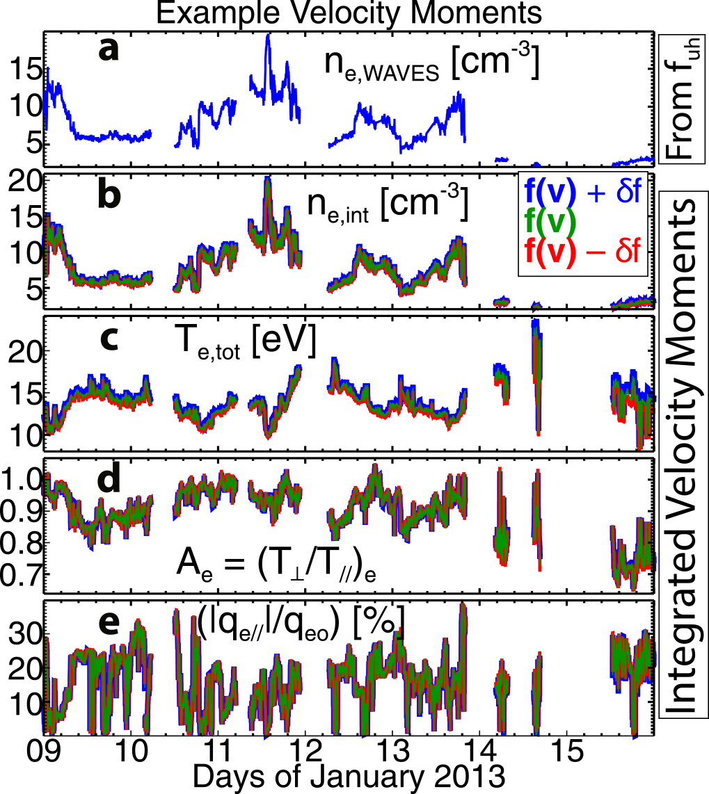 Calibrated electron velocity moments for the same time period as shown in Figure 2. The panels are as follows: (a) ne,WAVES (derived from fuh) [cm−3]; (b) the zeroth velocity moment, ne,int [cm−3]; (c) the total electron temperature, Te,tot [eV]; (d) the electron temperature anisotropy, Ae [N/A]; (e) the signed, normalized parallel electron heat flux, ﹩\tfrac{| {q}_{e,\parallel }| }{{q}_{\mathrm{eo}}}﹩ [%]. The last panel is shown as a percentage rather than a fraction, where ﹩\tfrac{| {q}_{e,\parallel }| }{{q}_{\mathrm{eo}}}﹩ = 0% means no parallel heat flux. The heat flux is normalized to the free streaming limit (e.g., S. P. Gary et al. 1999) defined in Equation (A1j).