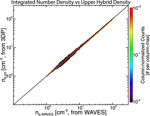 A 2D column-normalized histogram of ne,int [cm−3] vs. ne,WAVES [cm−3]. The columns are normalized by the maximum number of counts of all the histogram bins in that column. The diagonal black line shows when ne,int = ne,WAVES. Only data with Quality Flag ≤ 7 are shown (see Appendix D for definitions).