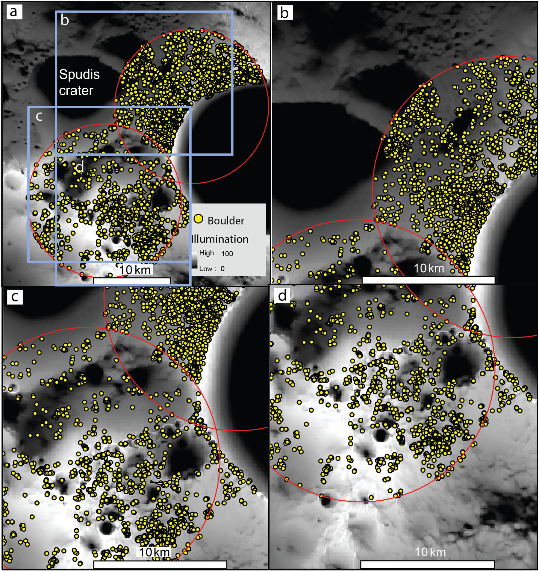 Boulder distribution in sunlit regions overlaid on a Wide Angle Camera (WAC) south pole illumination map from Mazarico et al. (2011) (100 m pixel−1). (a) Context figure for (b)–(d). Red circles show the mapped area. Yellow points show the locations of individual boulders, and the blue squares show the locations of (b)–(d). (b) Distribution of boulders near large PSRs to the left of the image just on the edge of the mapping area. Bickel et al. (2021, 2022) found additional boulders in some of those PSRs (not shown here). (c) Boulder distribution across the “Connecting Ridge” area and fewer boulders seen surrounding the PSRs to the top of the image. (d) Boulder distribution to the base of the “Connecting Ridge” slope, more boulders seen surrounding the PSRs that cover crater floors.